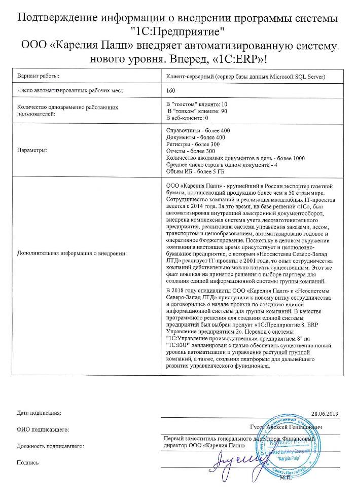 ООО «Карелия Палп». Внедрение «1С:Управление холдингом» компании Неосистемы Северо-Запад