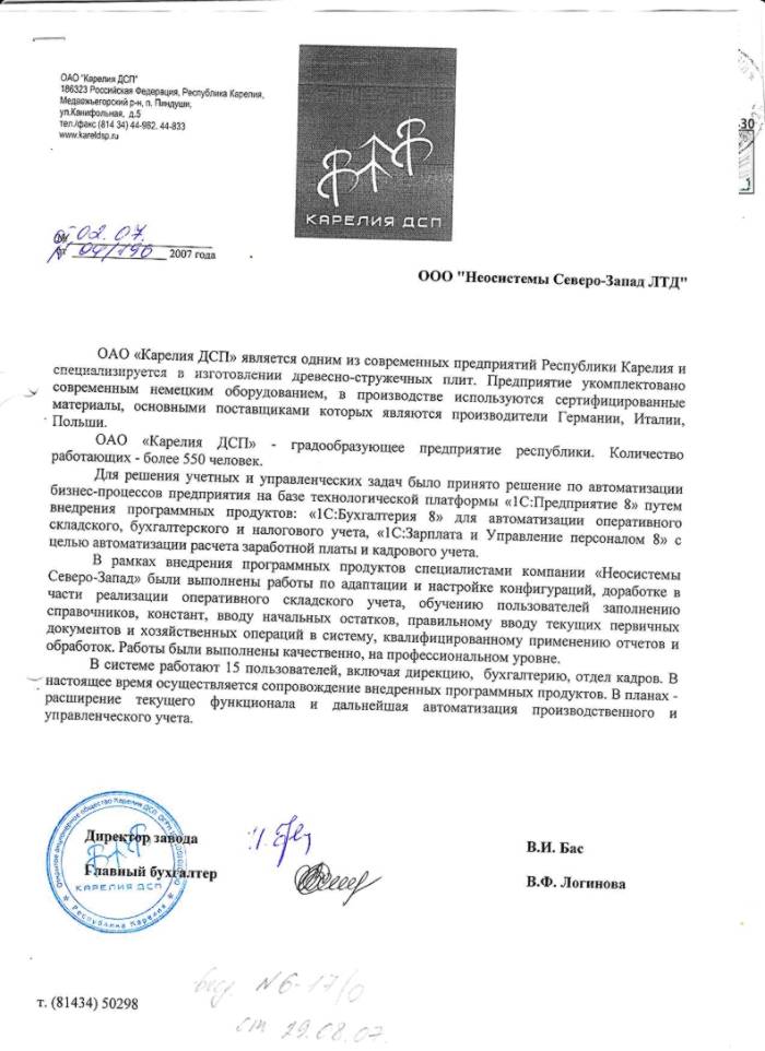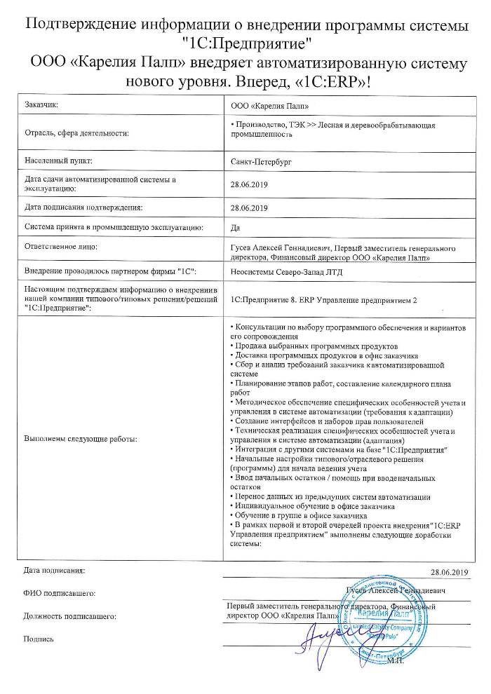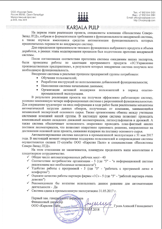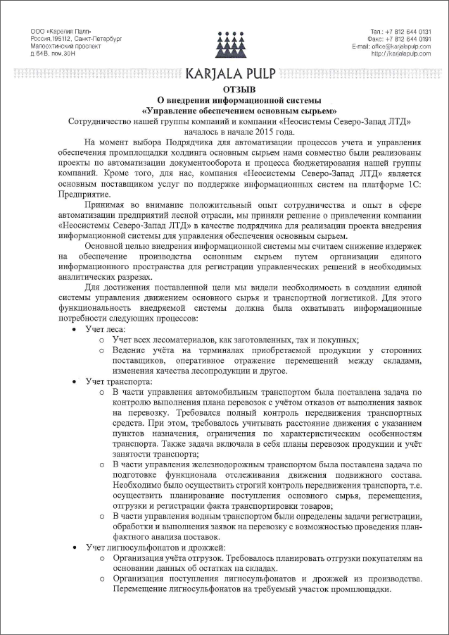 ООО «Карелия Палп». Реализации проекта внедрения информационной системы компании Неосистемы Северо-Запад