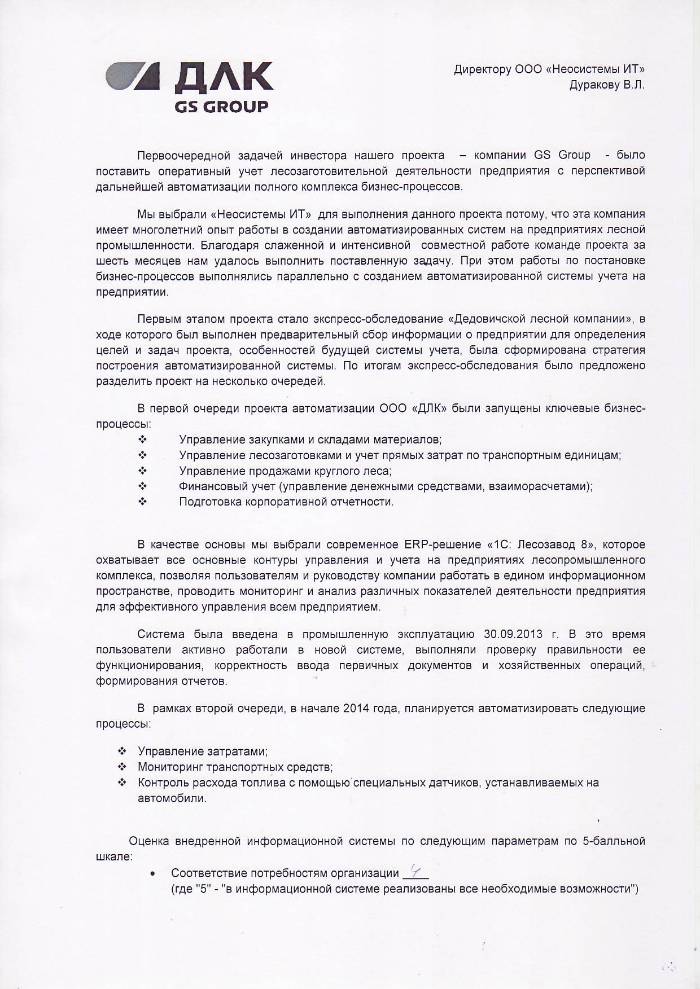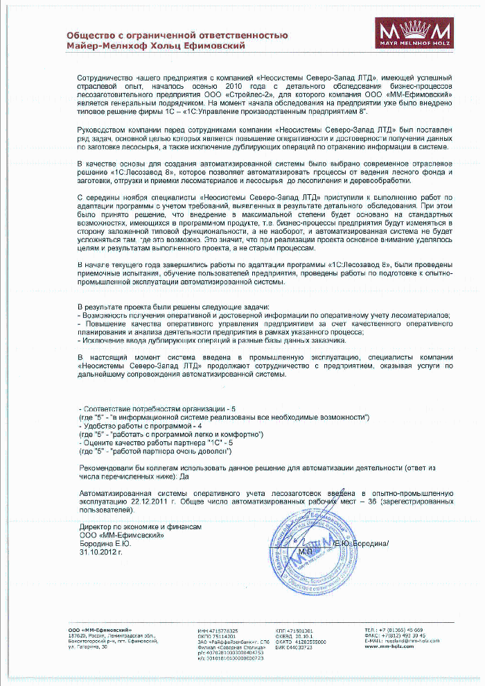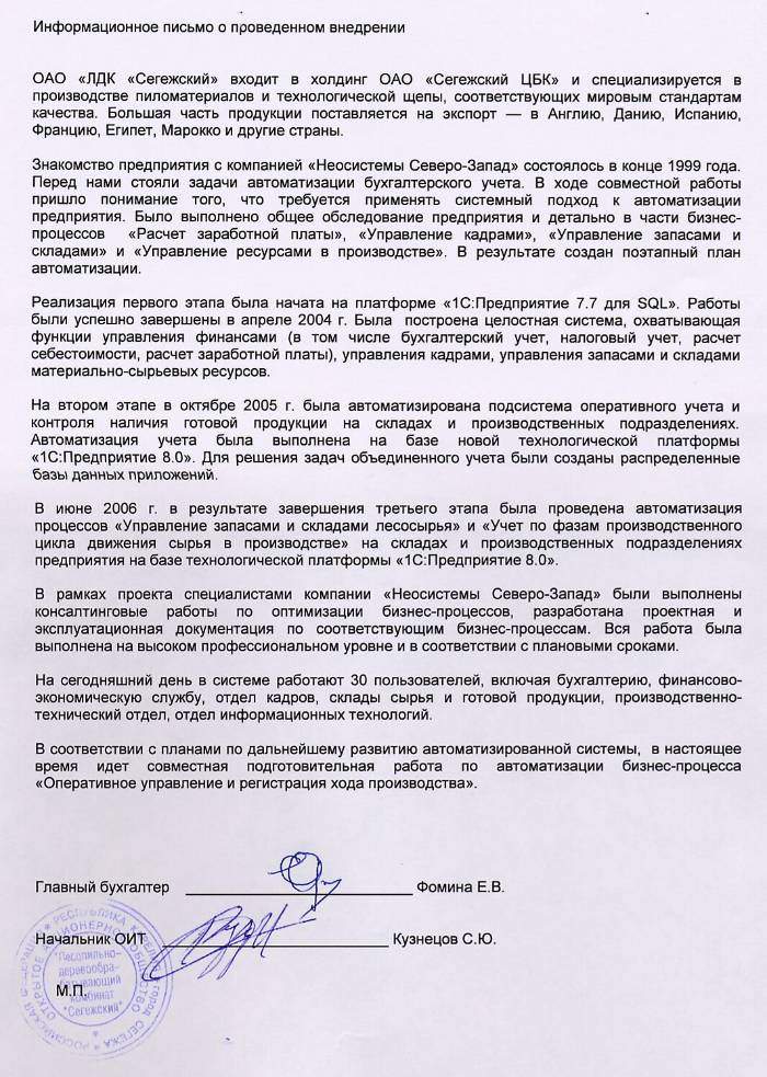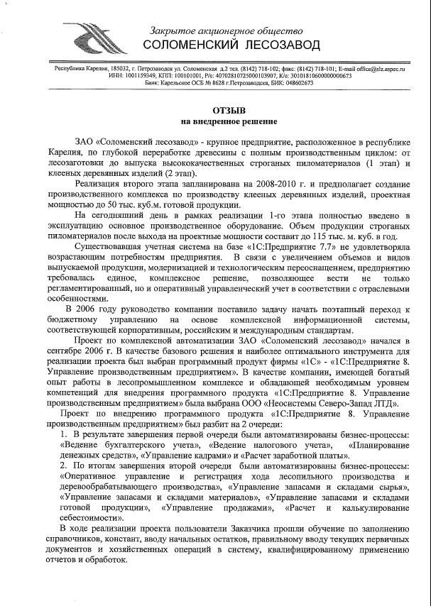 В 2006 году руководство компании поставило задачу начать поэтапный переход к бюджетному управлению на основе комплексной информационной системы, соответствующей корпоративным, российским и международным стандартам. В качестве компании, имеющей богатый опыт работы в лесопромышленном комплексе и обладающей необходимым уровнем компетенций для внедрения программного продукта «1С:Предприятие 8. Управление производственным предприятием» была выбрана ООО «Неосистемы Северо-Запад ЛТД».