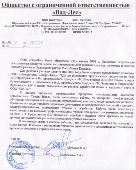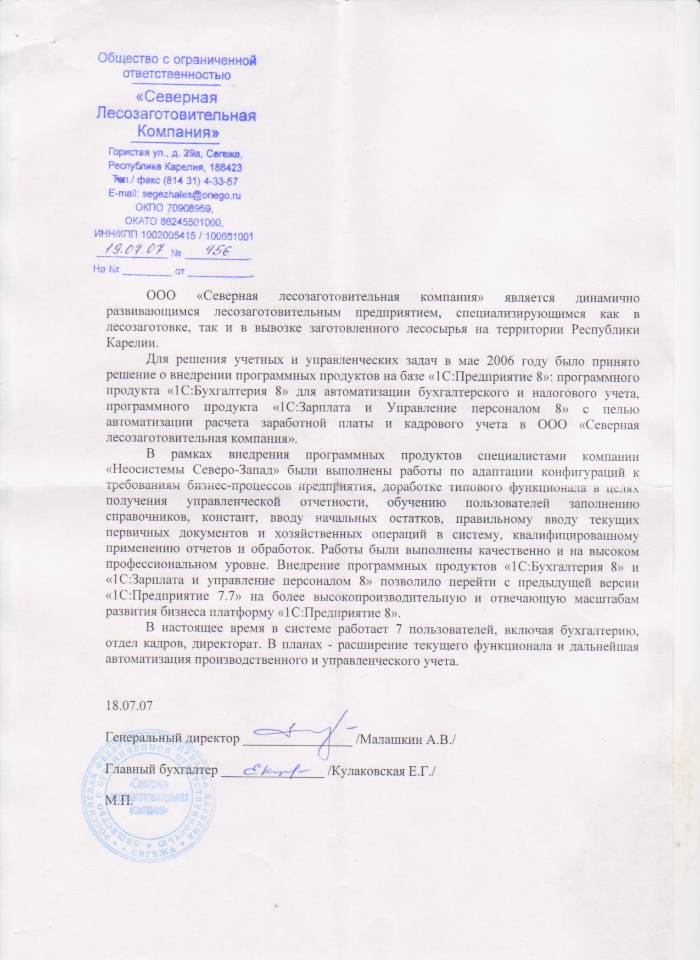 В середине 2014 года недавно открытая лесозаготовительная компания ООО «Карелия Лес» встала перед необходимостью ведения как регламентированного учета, так и оперативного и управленческого учета, с целью дальнейшего предоставления управляющей компании своевременной и достоверной информации о состоянии дел. Определяющим фактором выбора «Неосистемы Северо-Запад ЛТД» в качестве компании-внедренца был ее многолетний опыт в автоматизации регламентированного, оперативного и управленческого учета на предприятиях лесной отрасли.