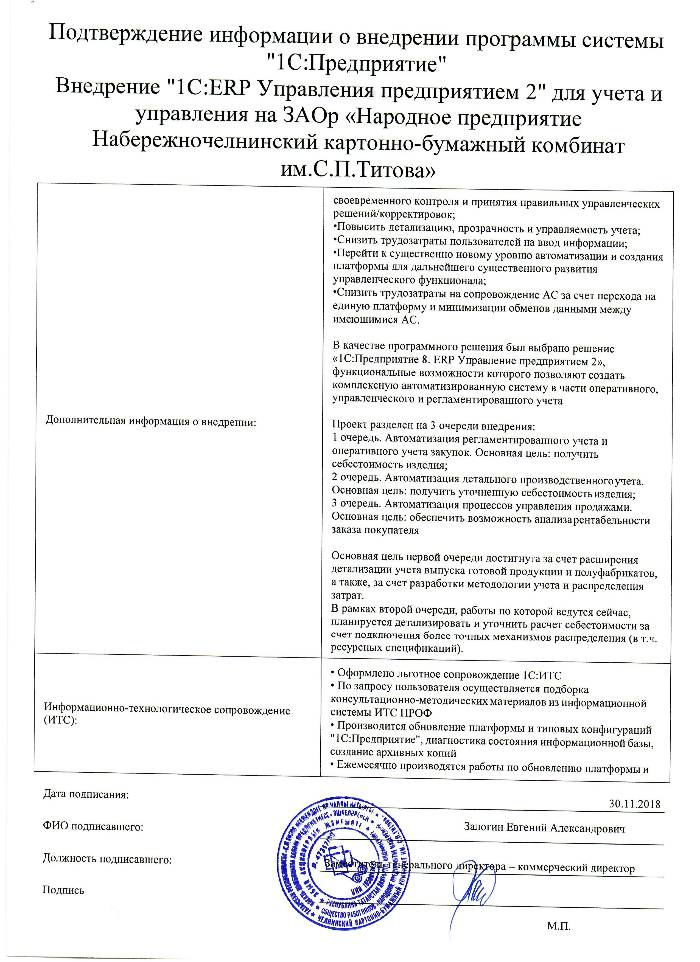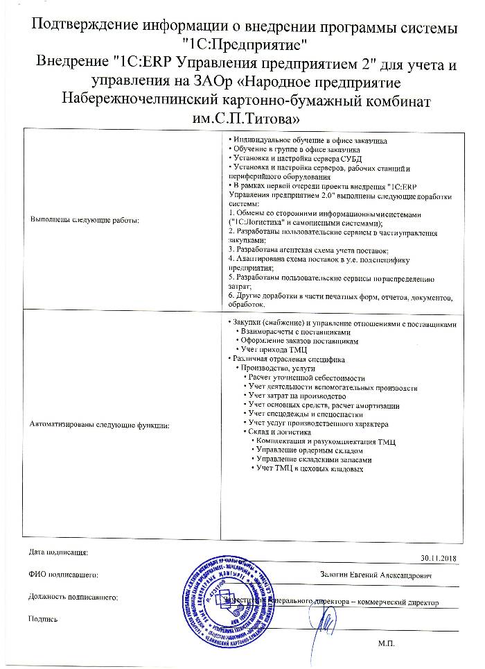 Работы по внедрению программного продукта «1С:Управление производственным предприятием 8» выполняются качественно, в соответствии с согласованными сроками.