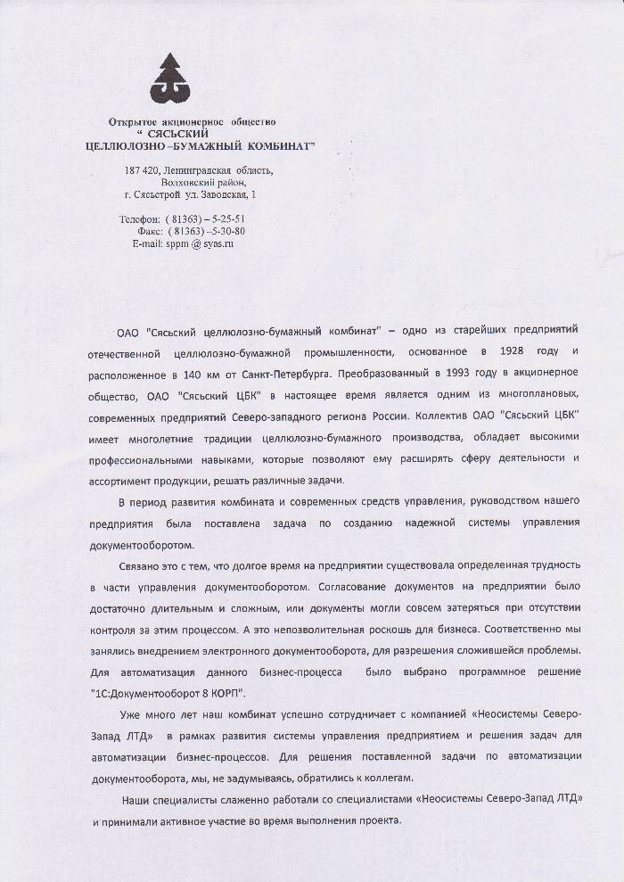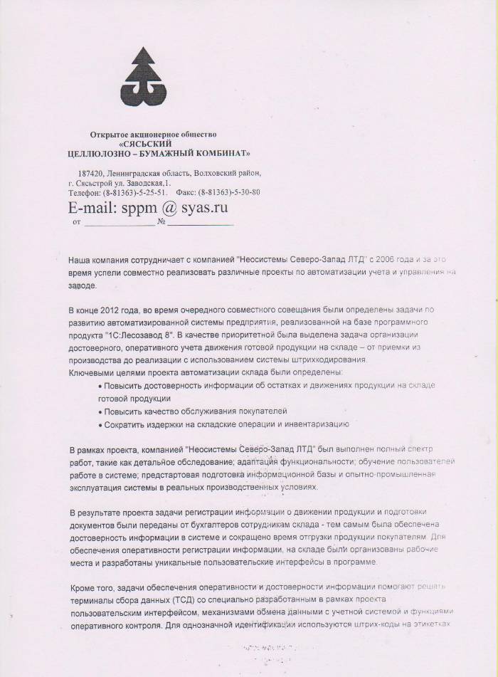 ОАО «Сясьский целлюлозно-бумажный комбинат» - внедрение «1С:Лесозавод» компании Неосистемы Северо-Запад