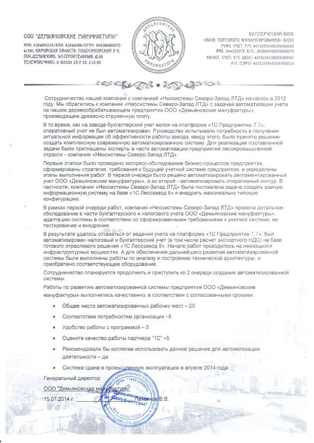 В рамках первой очереди работ, компания «Неосистемы Северо-Запад ЛТД» провела детальное обследование в части бухгалтерского и налогового учета ООО «Демьяновские мануфактуры», адаптацию системы в соответствии со сформированными требованиями к учетной системе, ее тестирование и внедрение.
