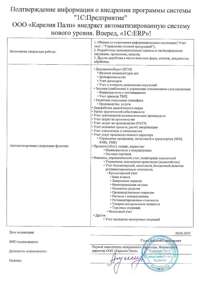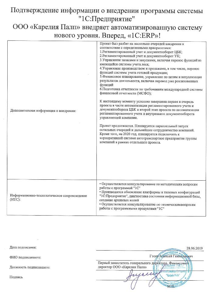 ООО «Карелия Палп». Реализации проекта внедрения информационной системы